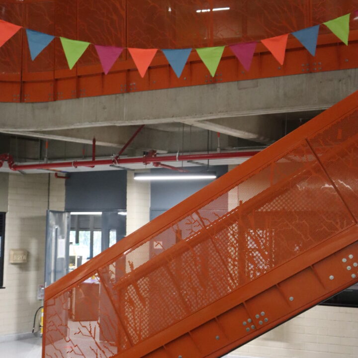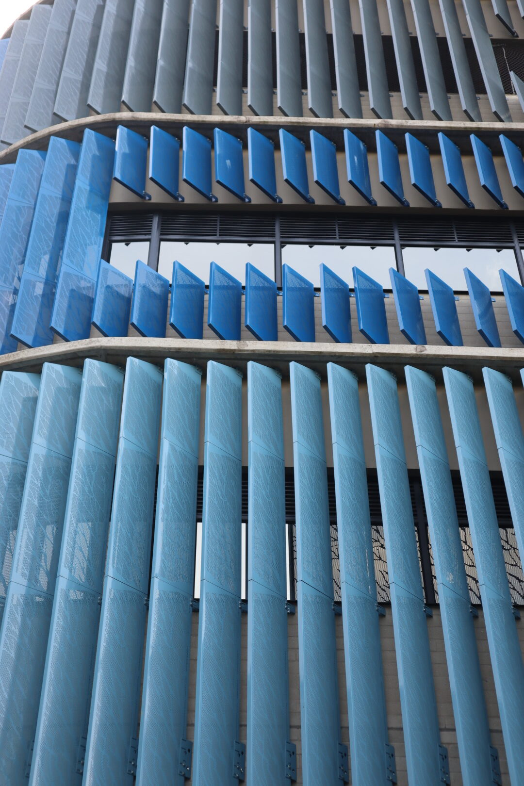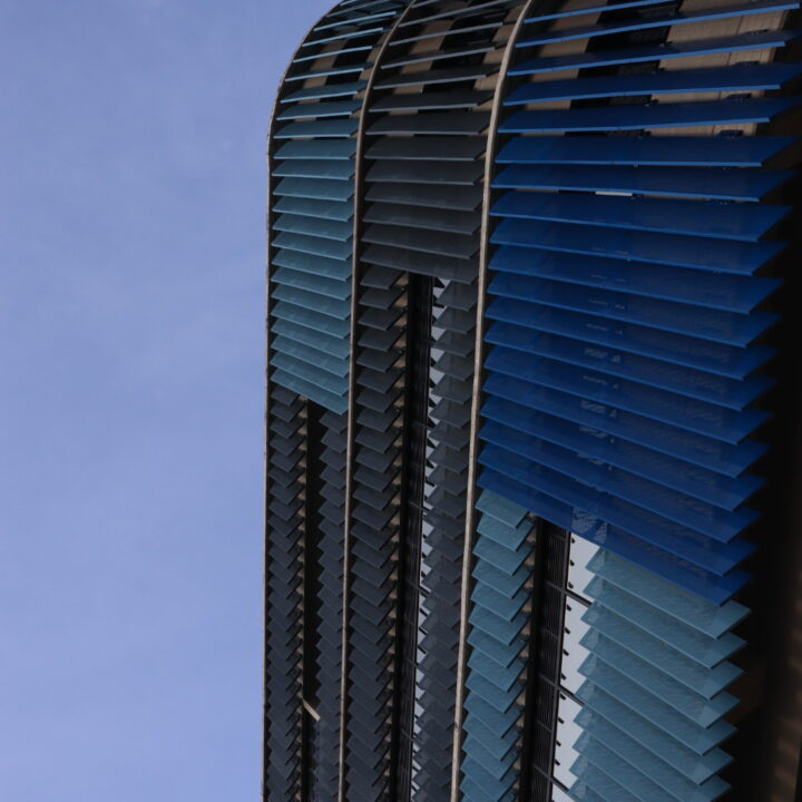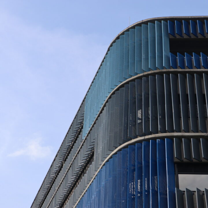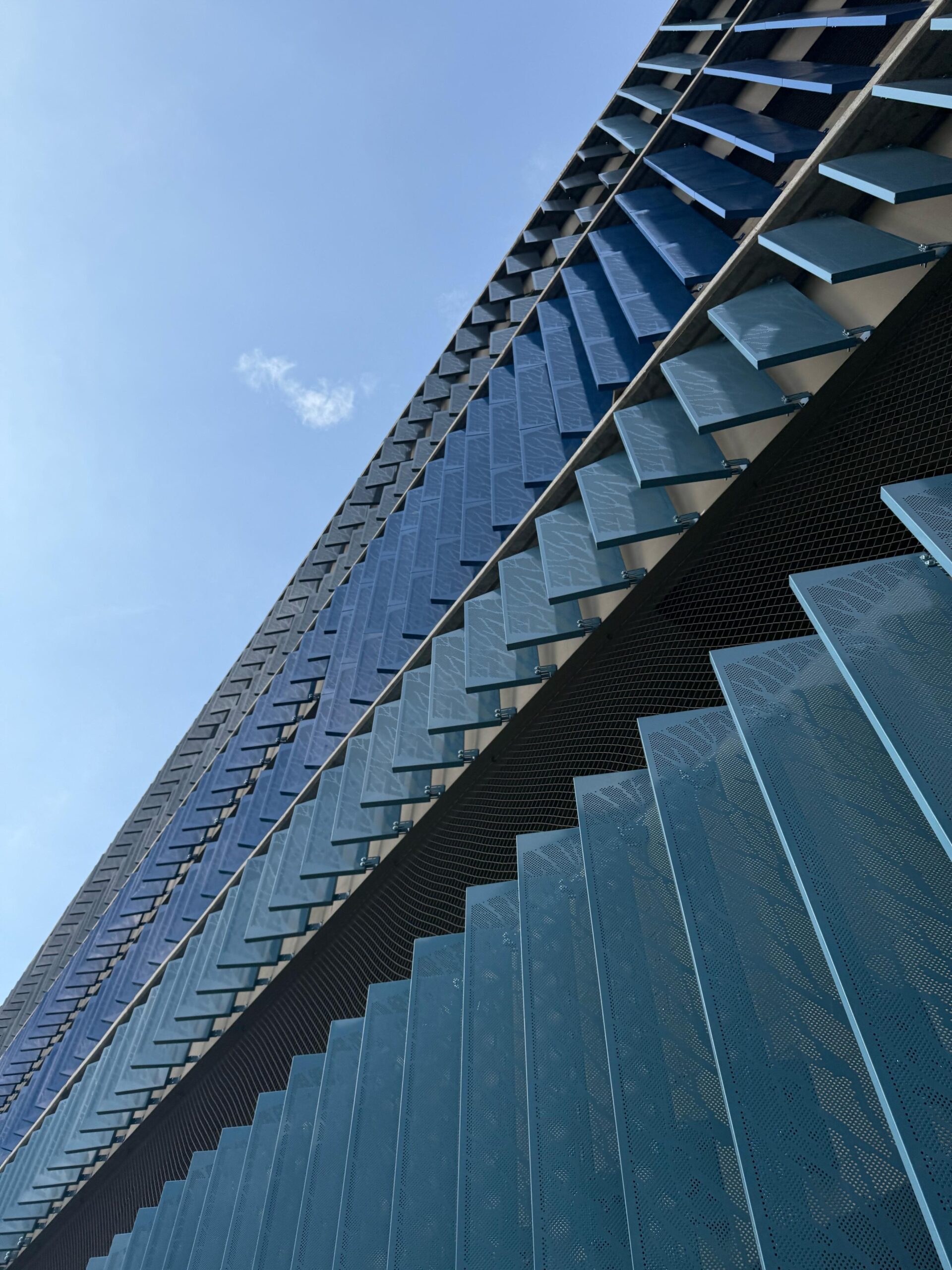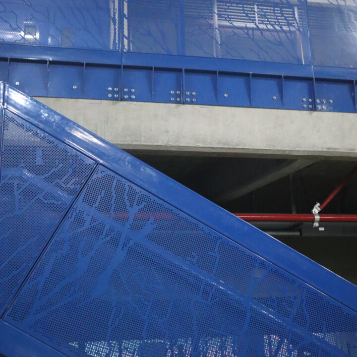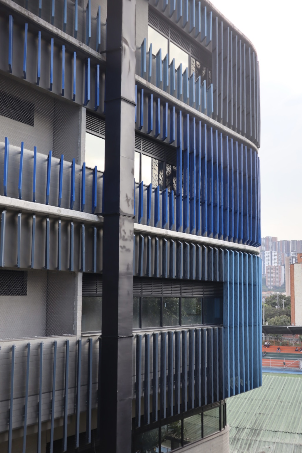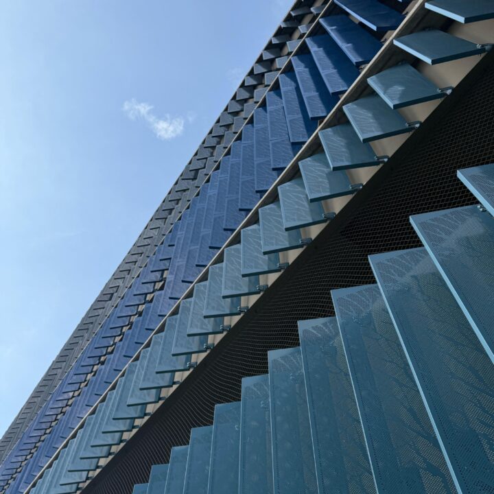 El proyecto también incluyó el desarrollo de revestimientos interiores en panel metálico y listones, aportando sofisticación y durabilidad a los espacios internos del edificio.