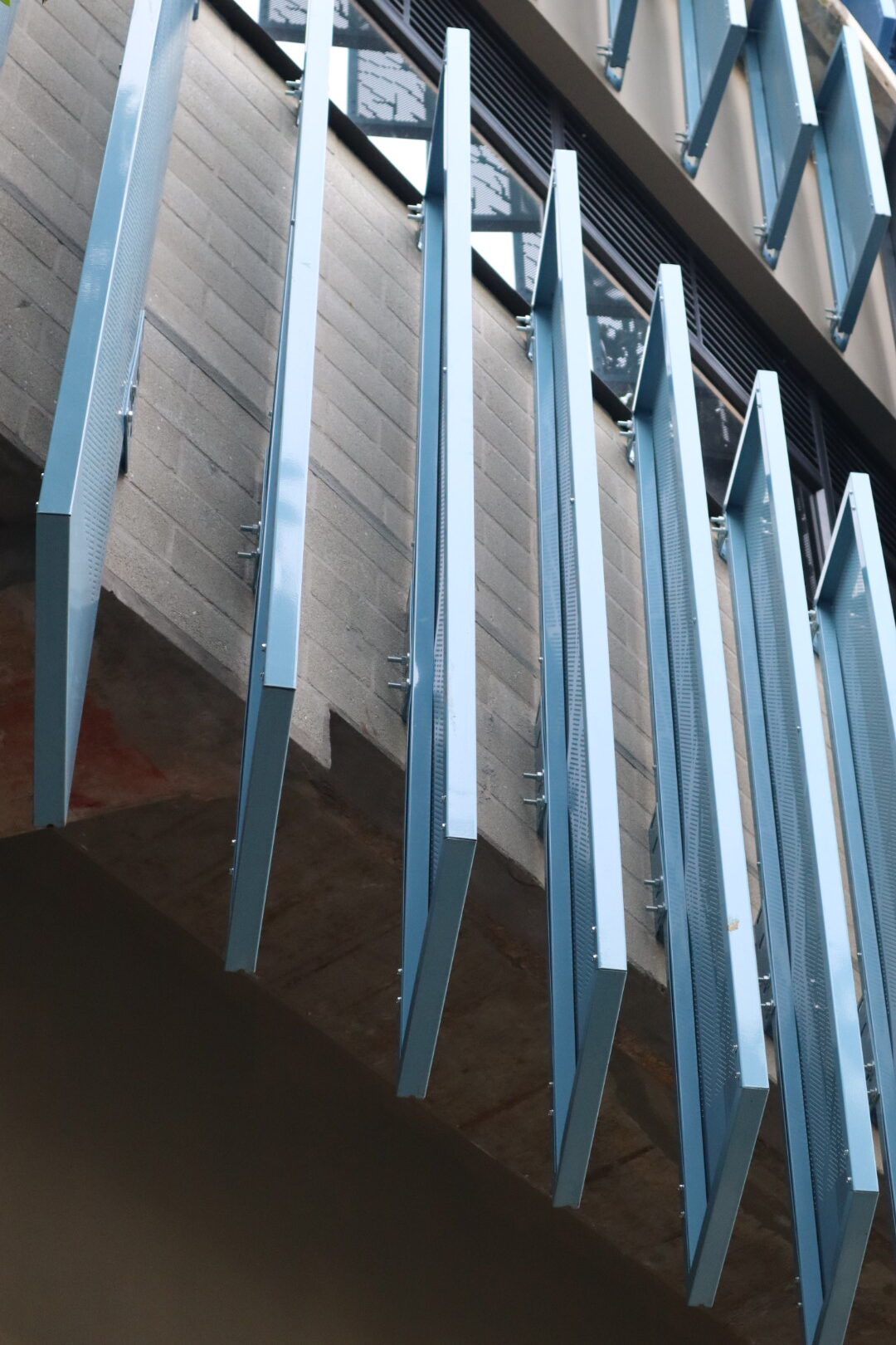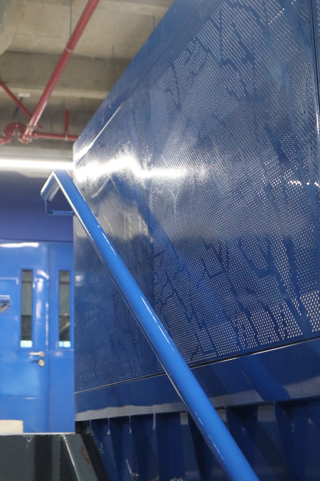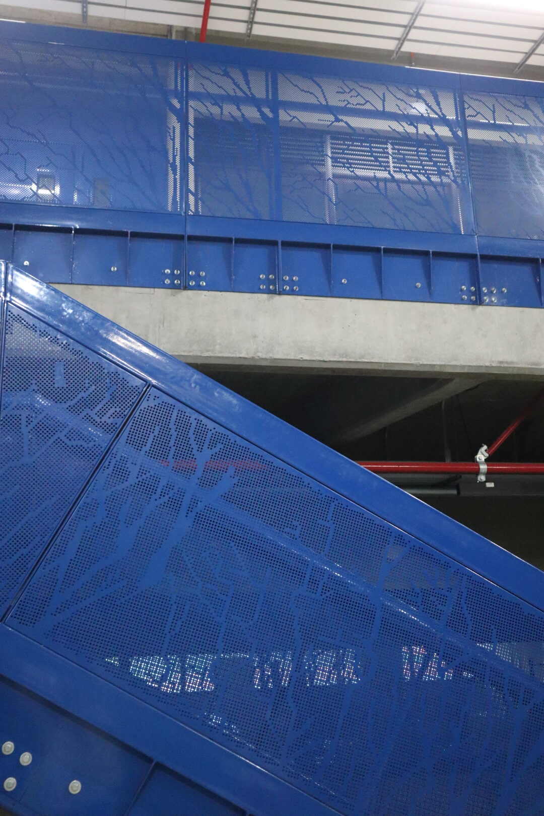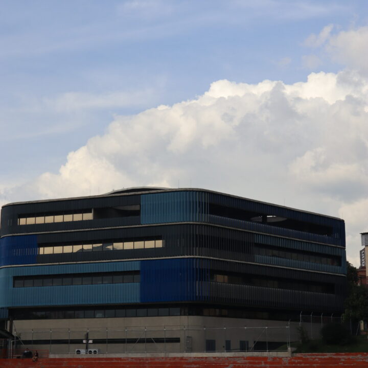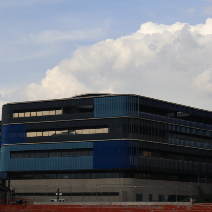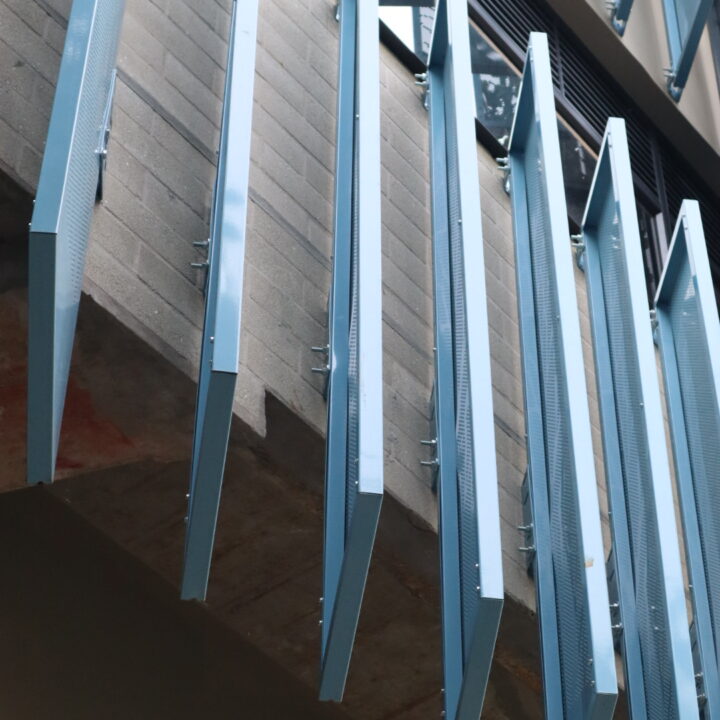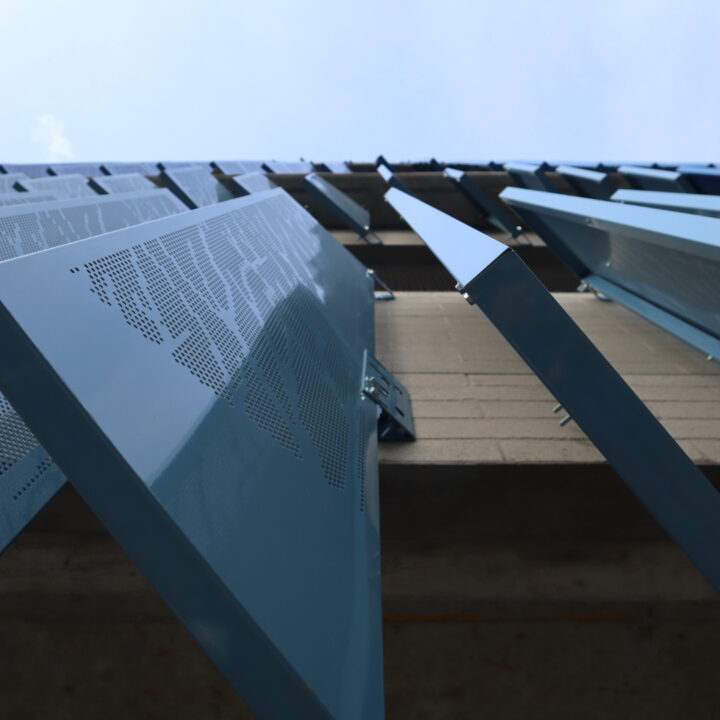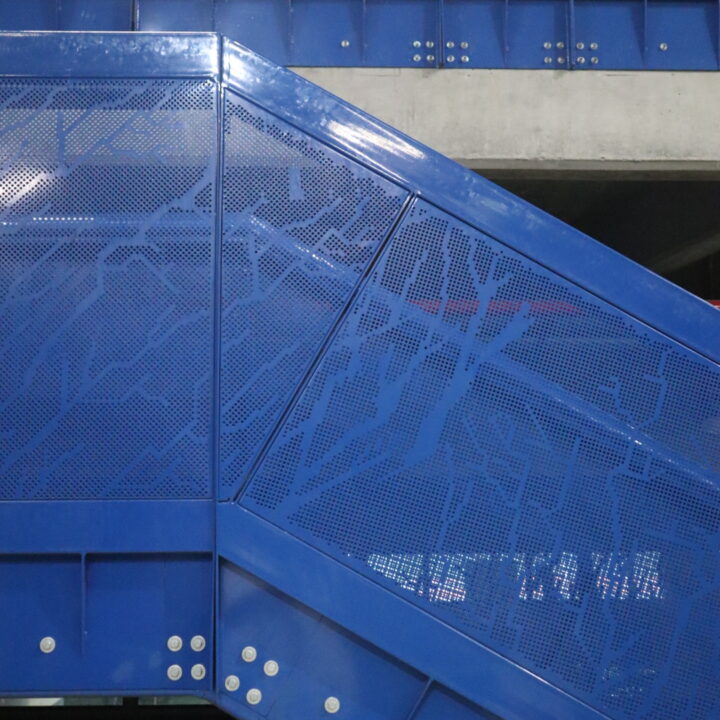 El proyecto también incluyó el desarrollo de revestimientos interiores en panel metálico y listones, aportando sofisticación y durabilidad a los espacios internos del edificio.