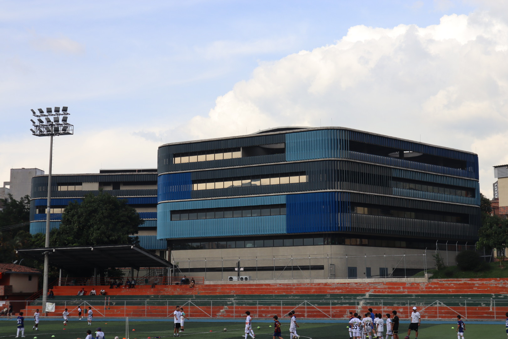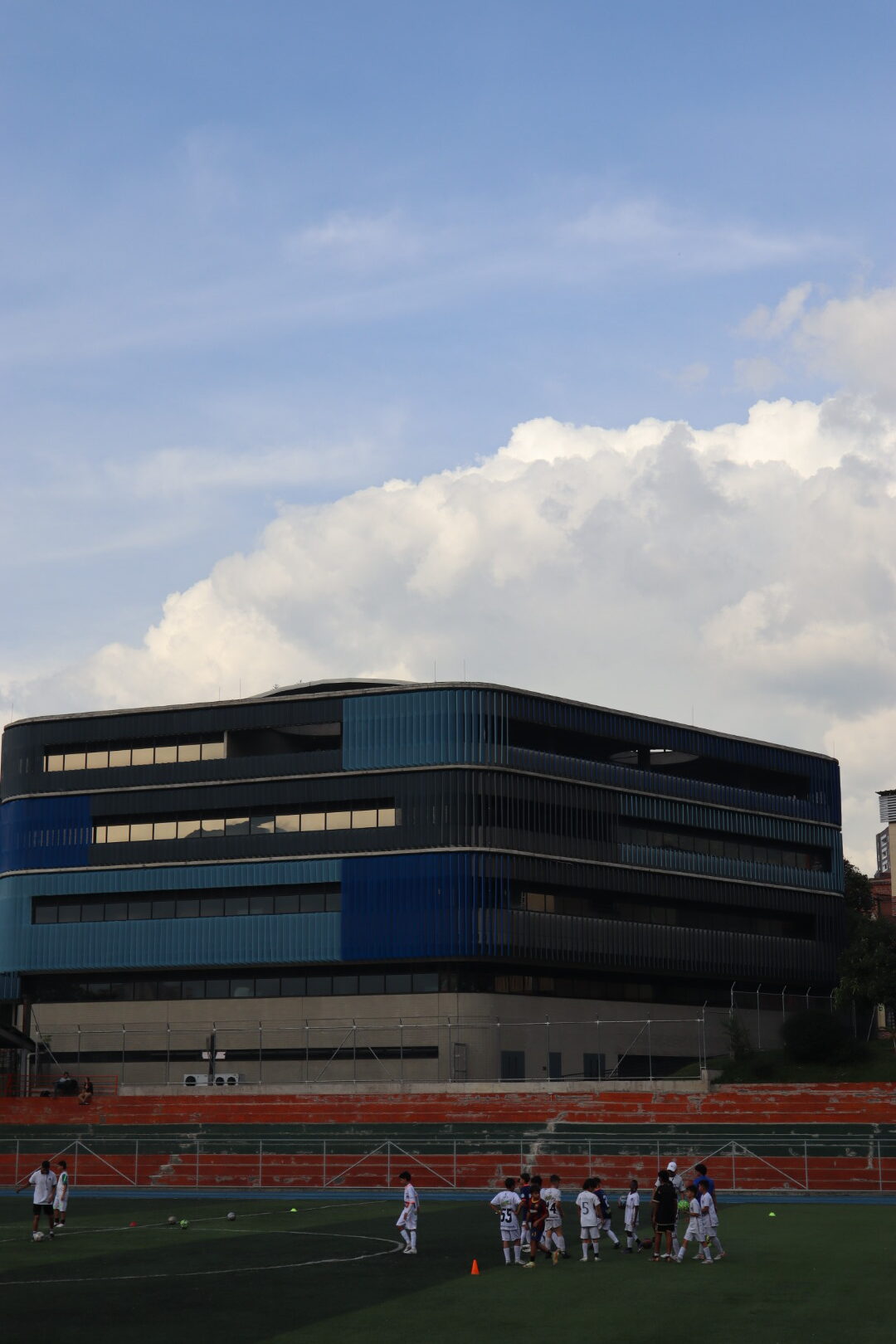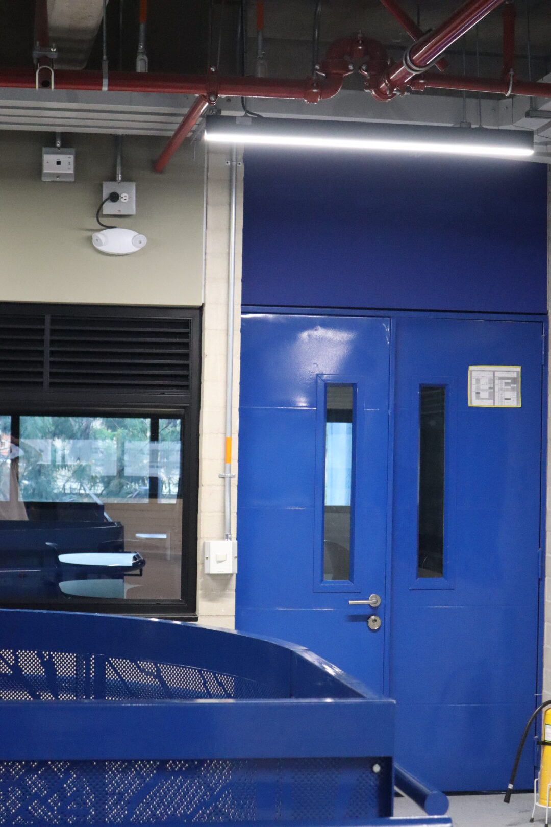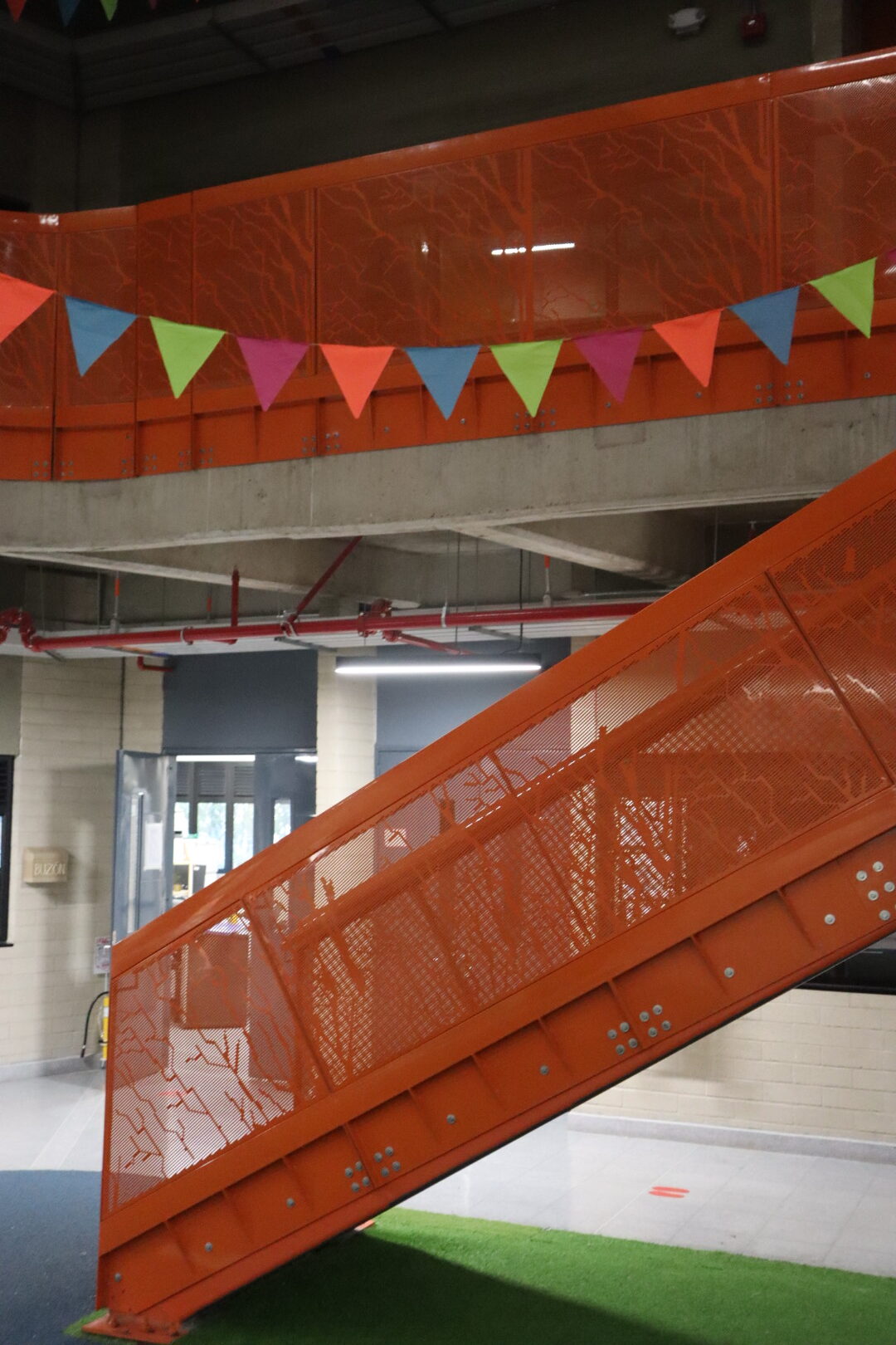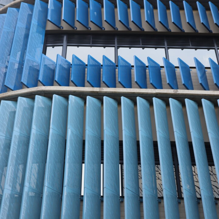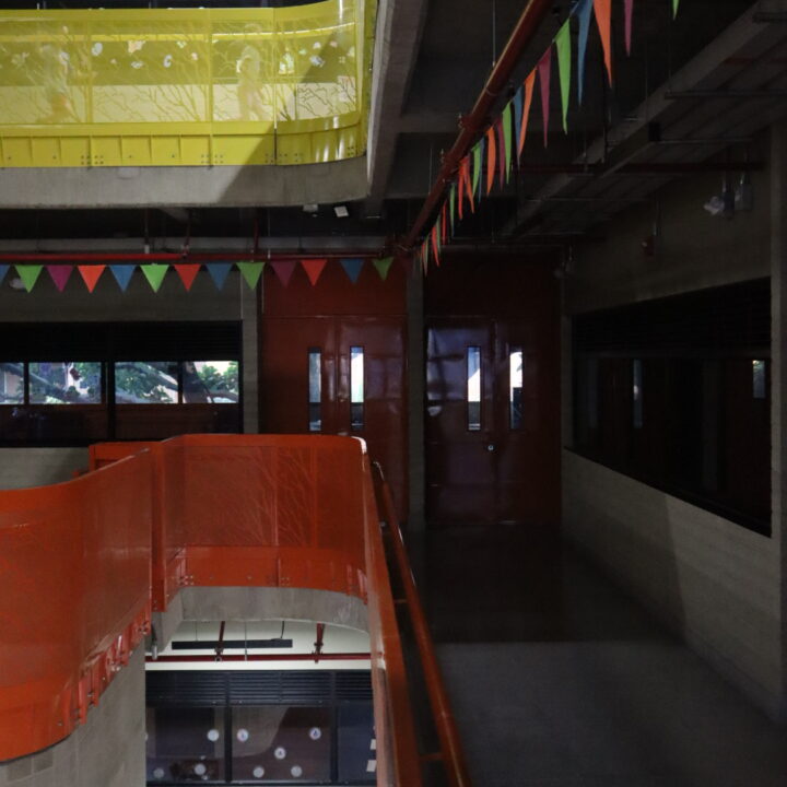 El proyecto también incluyó el desarrollo de revestimientos interiores en panel metálico y listones, aportando sofisticación y durabilidad a los espacios internos del edificio.